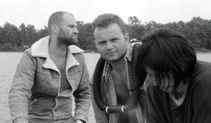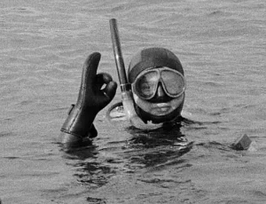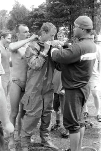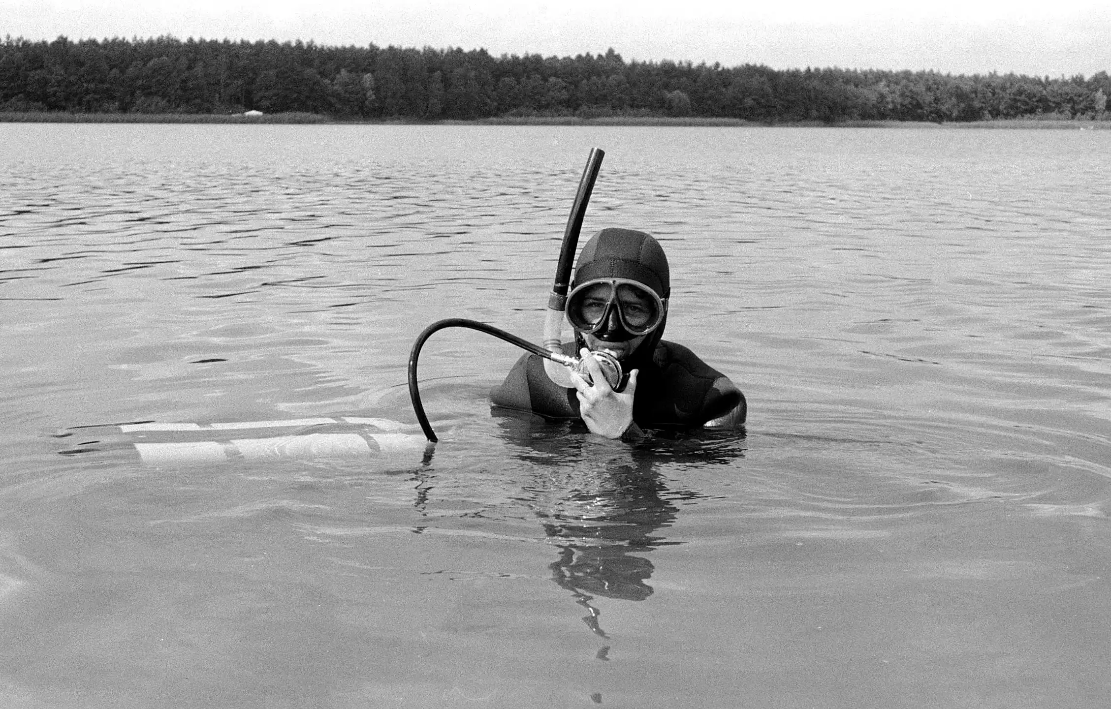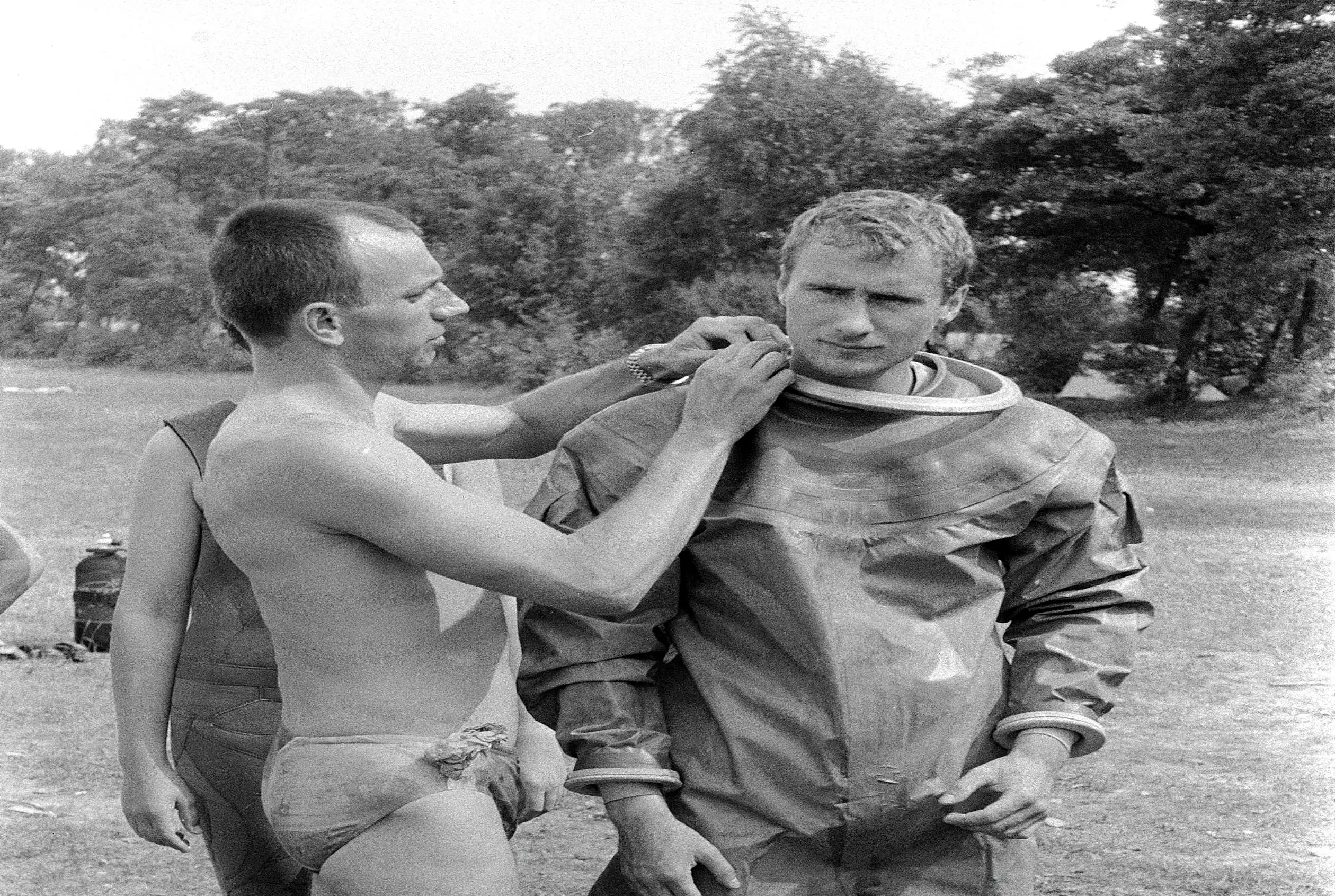 Kole­ga płet­wonurek Tomek z Łodzi ps. Żołnierz jest ubier­any do nurkowa­nia w pol­skim skafan­drze nurkowym Foka typu suchego, do zas­tosowań pro­fe­sion­al­nych. Już wtedy Foka była “retro” a dziś jest eksponatem muzeal­nym. Asys­tu­ją instruk­torzy Marek Saganows­ki i Janusz Parad­ows­ki …