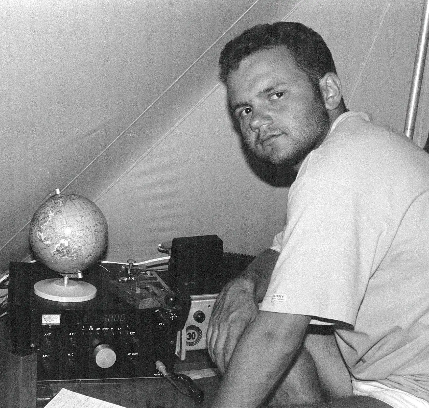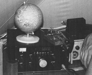 Radiostac­ja SP3SLU/3 zain­stalowana w moim namio­cie. Trans­ceiv­er i wzmac­ni­acz  “home-made”. A pon­ad namio­ta­mi, wśród drzew rozwies­zona ante­na W3DZZ. Globus w namio­cie, na obozie płet­wonurków to wynik fortelu jaki spraw­ił mi Jacek Z. kole­ga z zespołu muzy­cznego.
